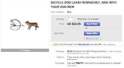 Placing your essentials in a non-essential item like a $55 leather case may be ironic, but Rapha is promoting this as a "stocking stuffer" for the holiday season, and exchanging non-essential items with practical applications is what adult gift-giving is all about. While you probably wouldn't buy one for yourself, you'd probably appreciate it from somebody else. Also, gifts are exempt from the "Schmuck or Sucker?" dilemma--in fact this is the point of modern gift-giving. That said, while Right About Now this is an Essentials Case, what it really is is an Old School purse. Even in these enlightened times, the process of branding man-bags is a delicate one. If you call it a "purse" then men feel self-conscious, but if you call it something too masculine then it just sounds like a scrotum. (Think, well, man-bag.) So while "Essentials Case" may be a bit pretentious, it's at least somewhere between being feminine and scrotal--though it may lean just a bit towards the latter. ("All You Haters Suck My Essentials Case.")Yes, in many ways cycling Right About Now is about never having to compromise, and this doesn't just apply to your clothes and your possessions. It also applies to your responsibilities. What if you have a dog who needs to be walked, but doing so will cut into your precious riding time? Well, a reader informs me that you can simply go to eBay and get one of these: