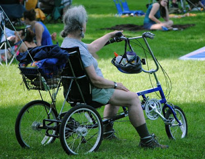 I can certainly see bicycles being useful in a disaster, but the main problem with them is that they're ridden by cyclists. And if you've ever set out with a group of cyclists you know there's that inevitable ten or fifteen minutes during which the two or three biggest know-it-alls in the bunch have to settle on a route. "Scranus to Frumunda then through the park and onto South Grundle?" "No, South Grundle's gonna be a mess this time of day, let's go around to Vulvanus." "Vulvanus is being resurfaced, let's take the Vas Deferens." And so forth. It's like a People's Front of Judea meeting. You can even see them doing it in the photo above, and that period of deliberation is going to mean the difference between life and death.