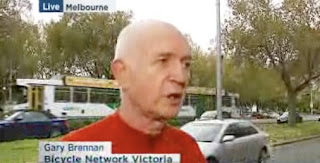 ABC is apparently the Australian national broadcaster, though judging from this segment it's what would happen if the BBC and Rupert Murdoch were to get drunk and conceive a child out of wedlock. The story is about a campaign to increase the fines on motorists who "door" cyclists in Melbourne, and in it a reporter interviews Gary Brennan of the Bicycle Network Victoria;