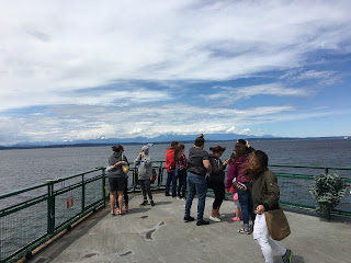 So I abandoned my tentatively-moored bike to its fate and made my way to the business end of the boat (or the "bow" for all you Boat Freds) to do some sightseeing. Upon my arrival I found some of my fellow passengers bravely fighting the powerful wind and marveling at what I assume are the Olympic Mountains in the distance: