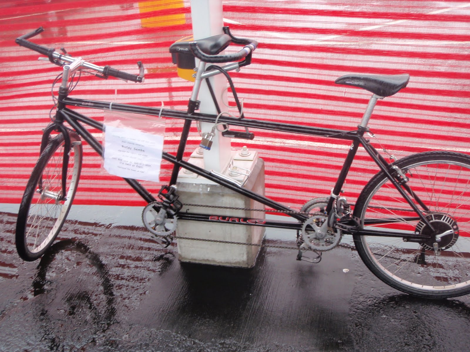 As much as I wanted to experience the "Power of Two," sadly I was only one person, and a soggy one at that. So I parked my loaner bike and my Top Gear helmet in the 1987-Threw-Up-On-My-Head colorway next to a pair of unicycles: