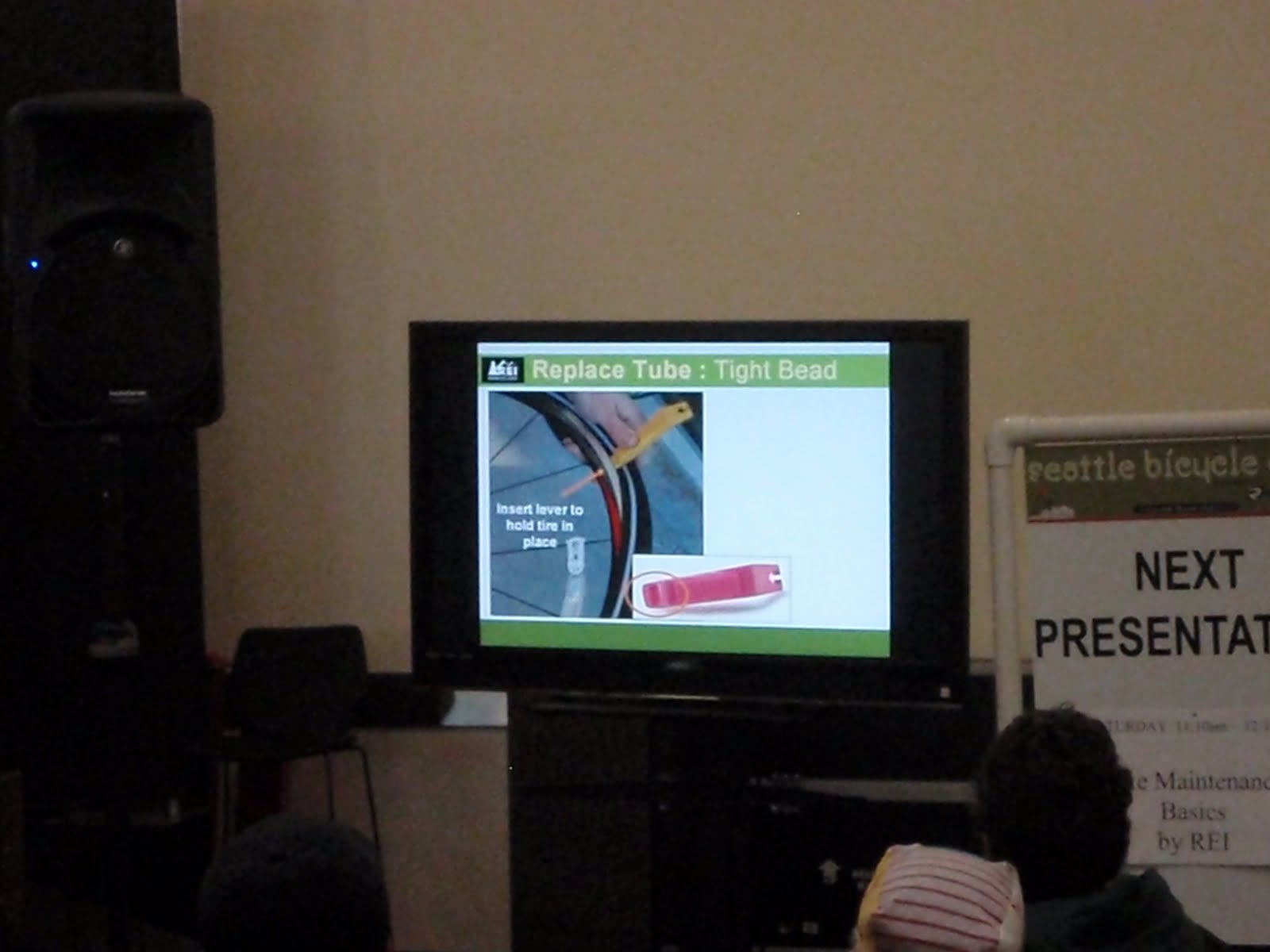The crowd stared in rapt amazement as the presenter demonstrated how to fix a flat: